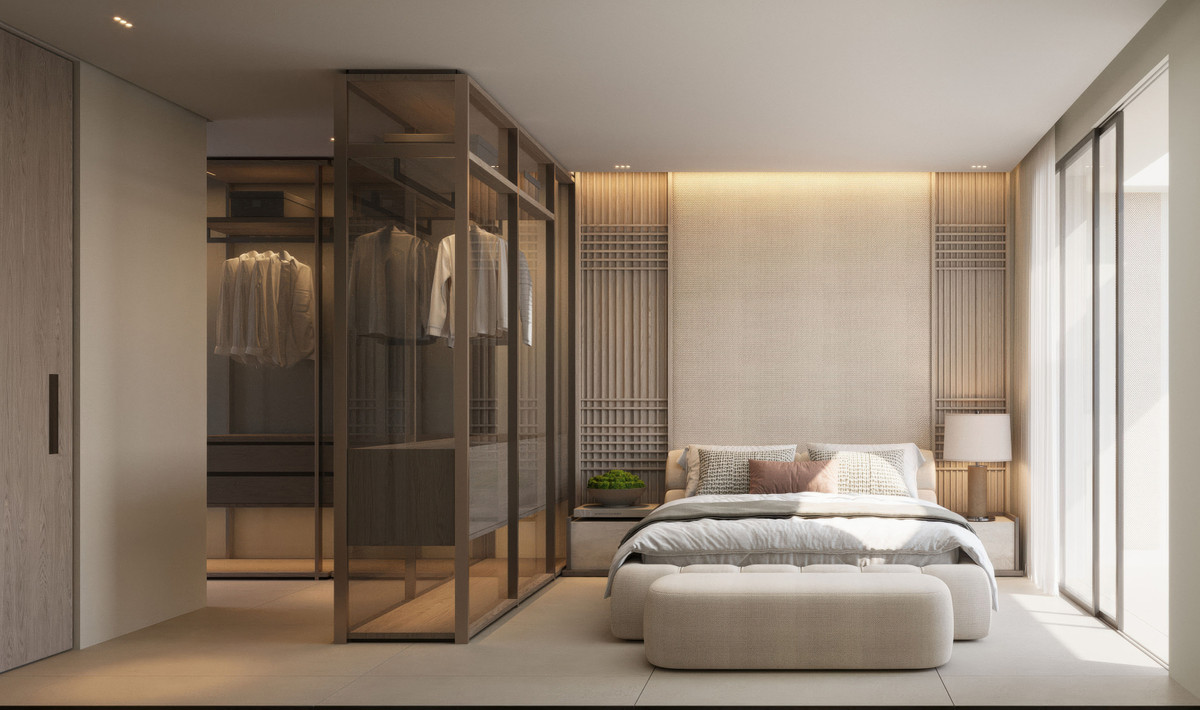 The bedrooms offer the same sense of calm and quality found throughout the apartment. Both rooms are designed with generous space, built-in wardrobes, and a clean, modern finish that keeps the atmosphere warm and organised. The main bedroom opens directly onto the terrace, allowing natural light to fill the space from morning to evening. The two bathrooms are finished with high-standard materials and soft lighting that give the spaces a refined, almost spa-like feel. Together, the bedrooms and bathrooms add a layer of comfort and practicality that completes the home.