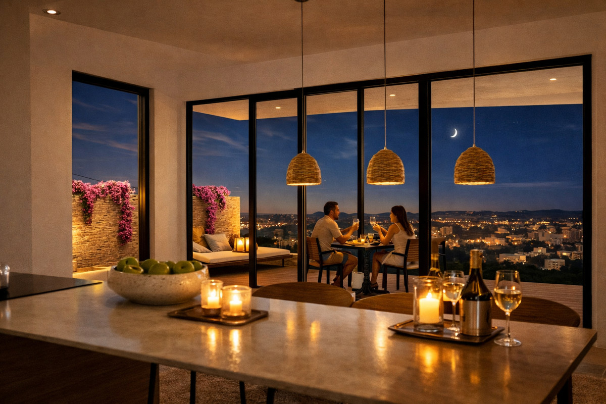 Each rooftop terrace offers panoramic views over Fuengirola Bay, the Mediterranean Sea, and the Mijas mountains, and can be customized with lounge areas, an outdoor kitchen, jacuzzi, or left minimal – entirely your choice.
